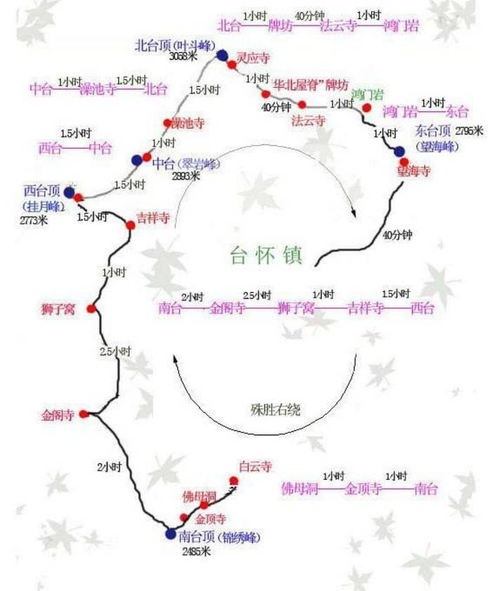 小圈或下撤路线:西台-中台-北台-鸿门岩-台怀镇-黛螺顶(住宿)或西台-东台挂单,第二天下撤至台怀镇